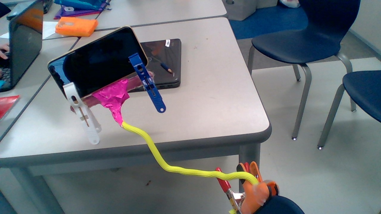 The Thunder Thinkers are proud to present the Phone Holder. This product holds your phone for you while you eat. The Phone Holder clips on to your chair, has a bendable neck, and has two clips to support your phone. There is a limited supply, so buy them before they are gone! 80% of the revenue will go to the St. Jude Hospital. This product is made from repurposed materials. The Phone holder is not waterproof, and not washing machine safe. Buy now!